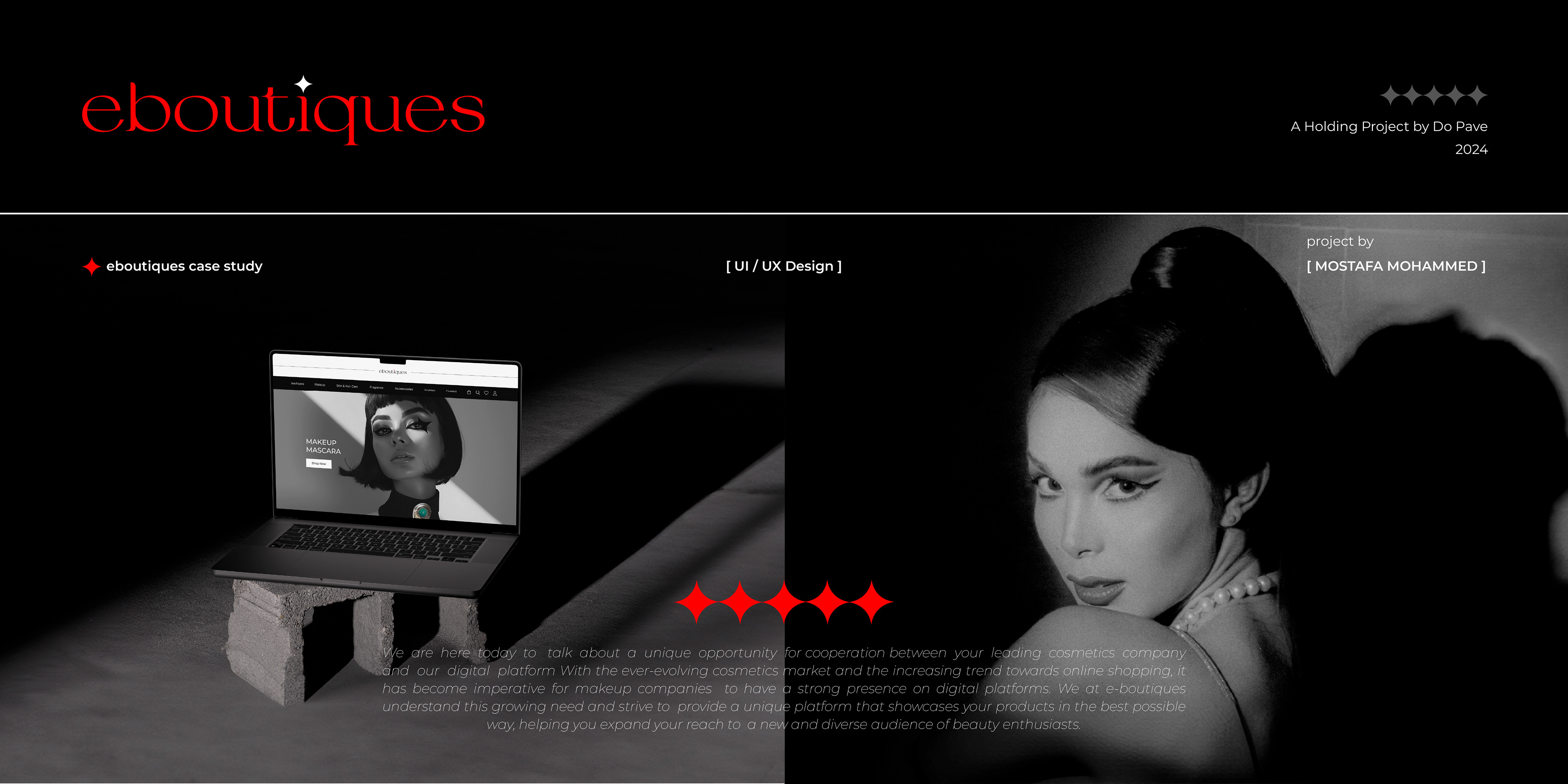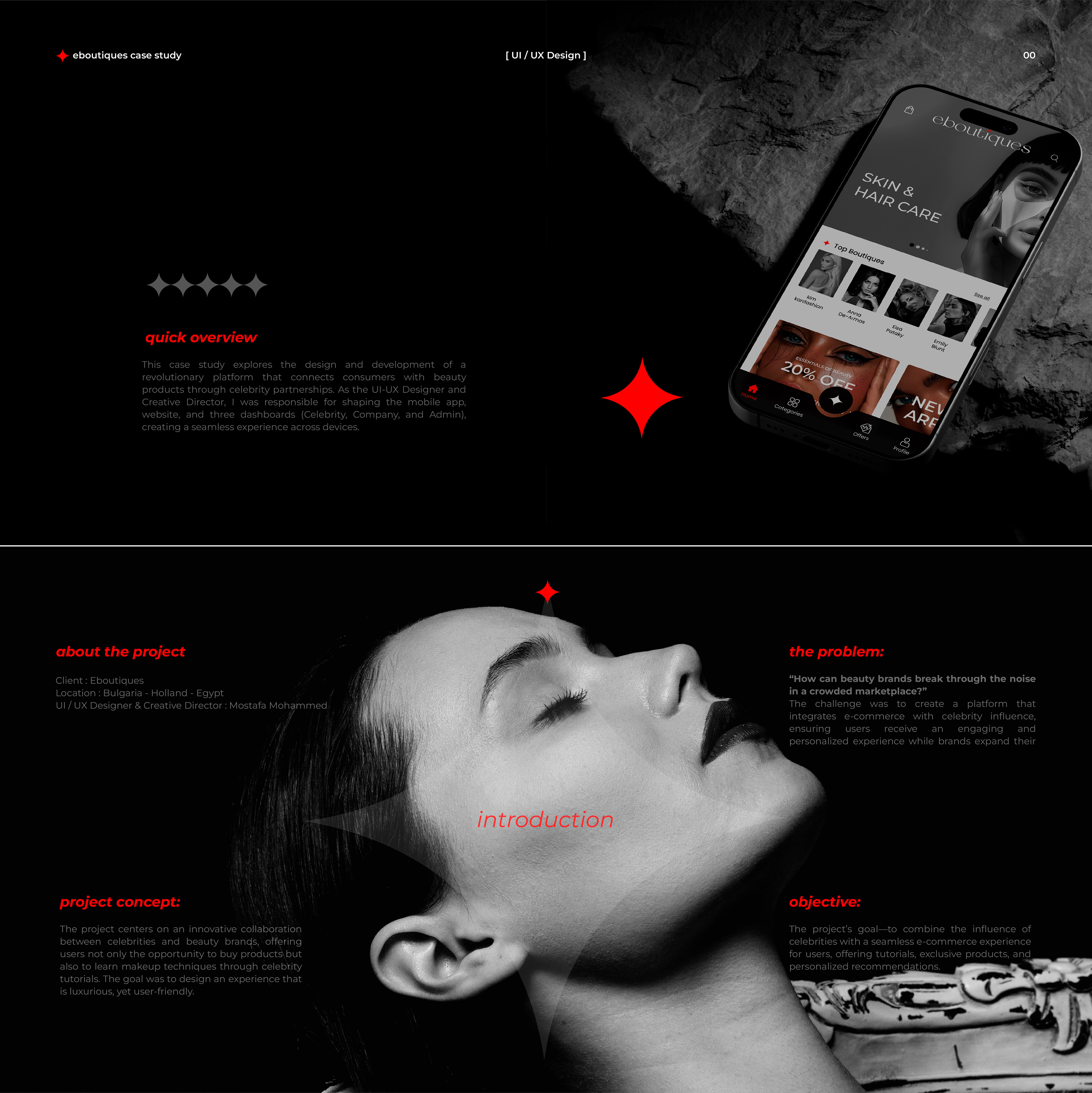 “E-Boutiques: The Art of Makeup & Luxury” E-Boutiques is a groundbreaking digital platform bridging the worlds of luxury makeup, cosmetics, and celebrity influence. The project encompasses a user-friendly mobile app, a sleek website, and three specialized dashboards (Celebrity, Company, and Admin), all designed to provide a seamless and immersive user experience. With a focus on elite aesthetics and intuitive functionality, E-Boutiques redefines how users engage with beauty products. The platform allows users to explore top celebrity-endorsed products, watch exclusive tutorials, and shop curated collections with ease. From blending bold branding with accessible design to ensuring a luxurious yet simple experience, this project showcases the perfect harmony of UI/UX innovation and visual storytelling. Dive into the design process and witness how every detail transforms into an extraordinary digital experience.